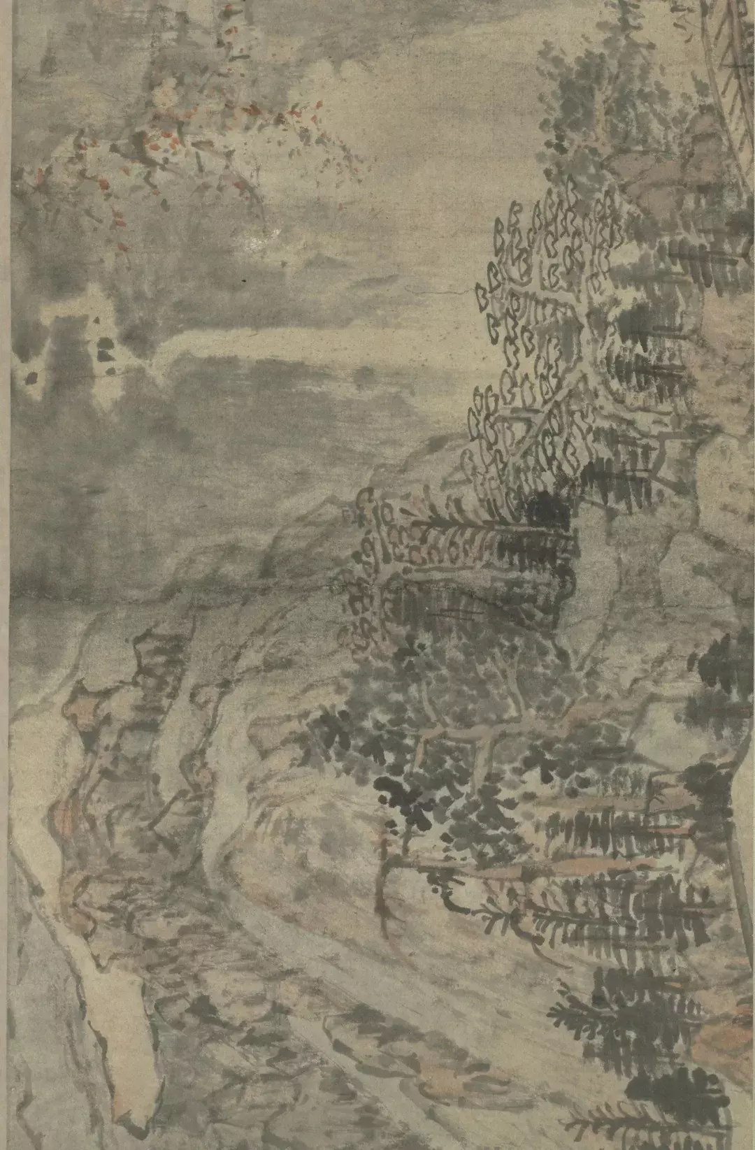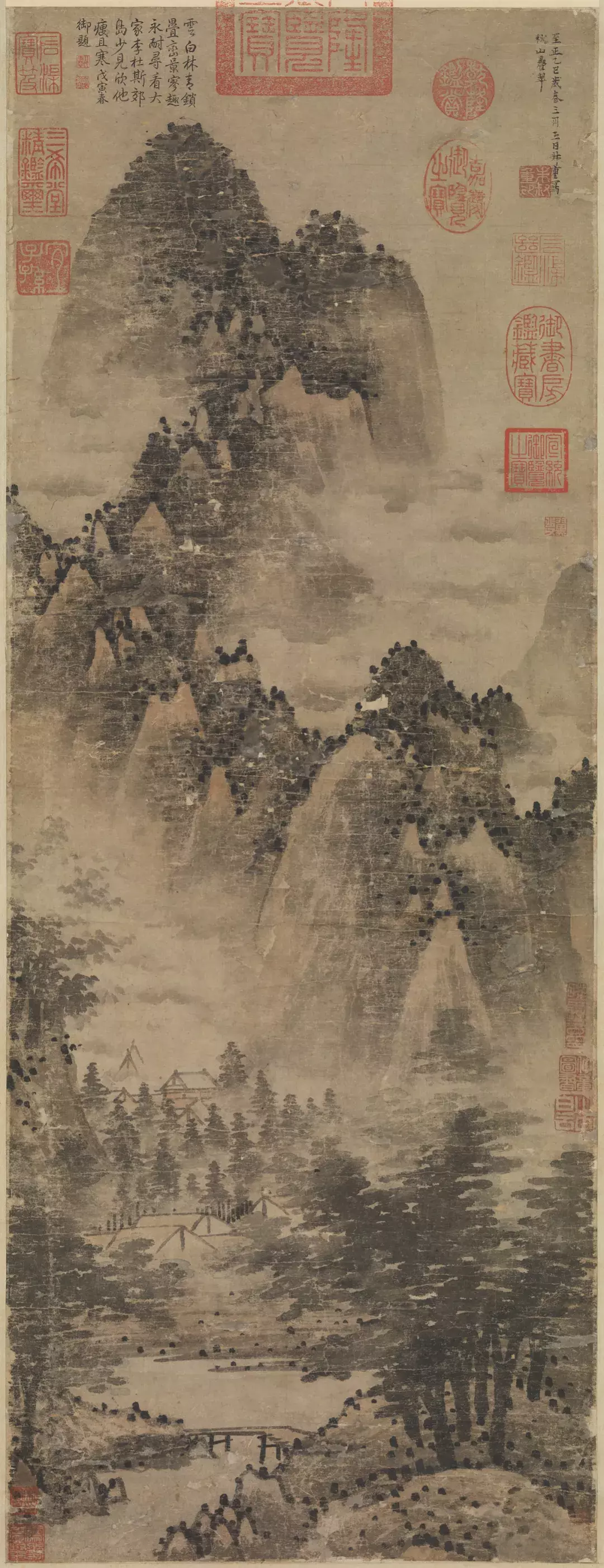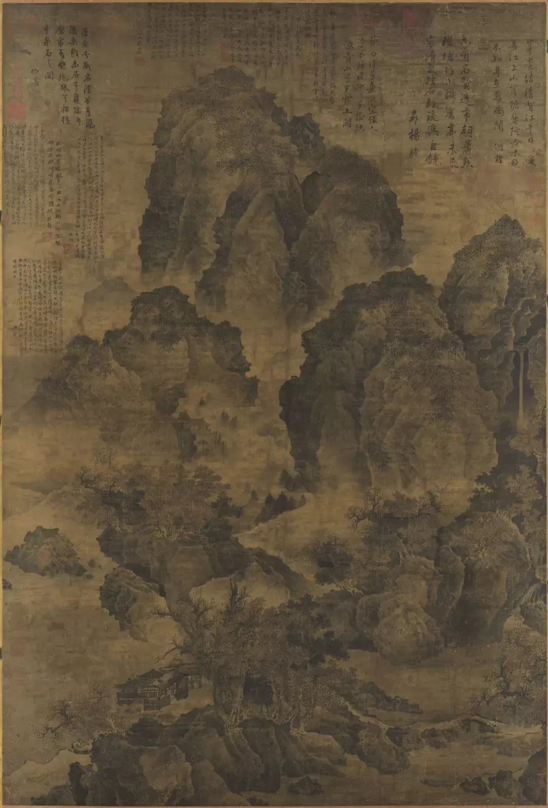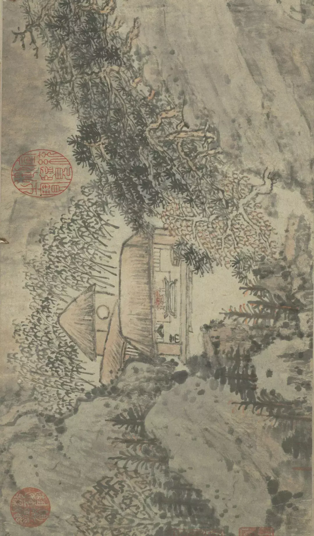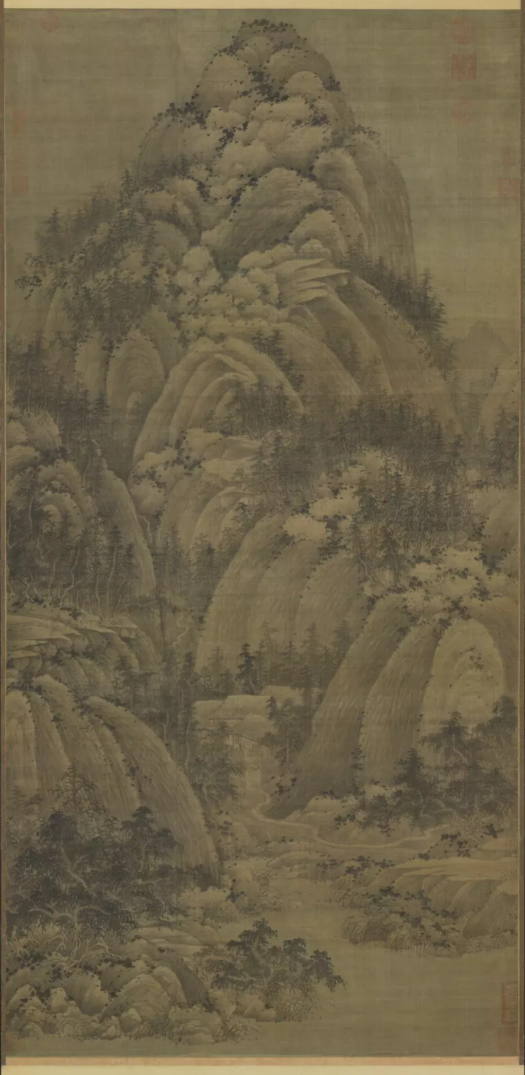 五代巨然《秋山问道图》:此画描绘了高远幽深的秋日山景,山峦重叠,秀润可爱。房舍掩映在茂林之中,小路曲折通幽,颇有山居之幽趣。又见溪水蜿蜒流淌,为画面增添了几分灵动。