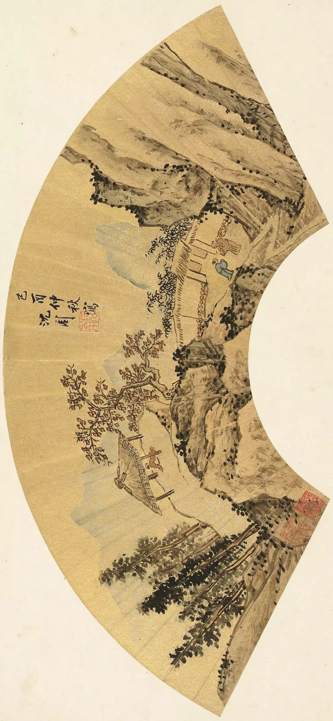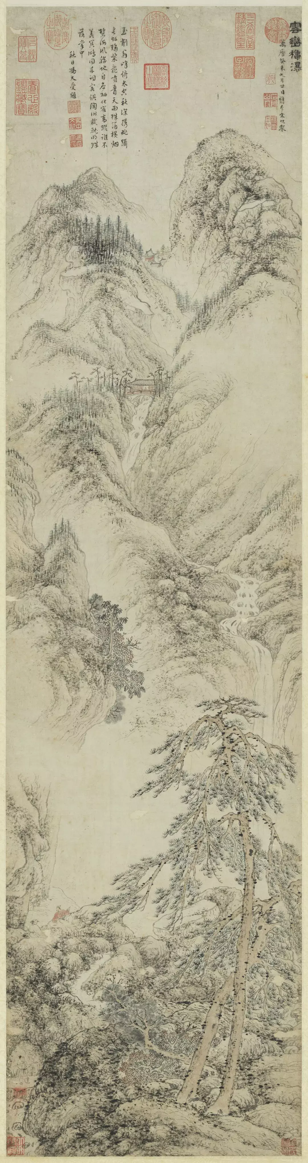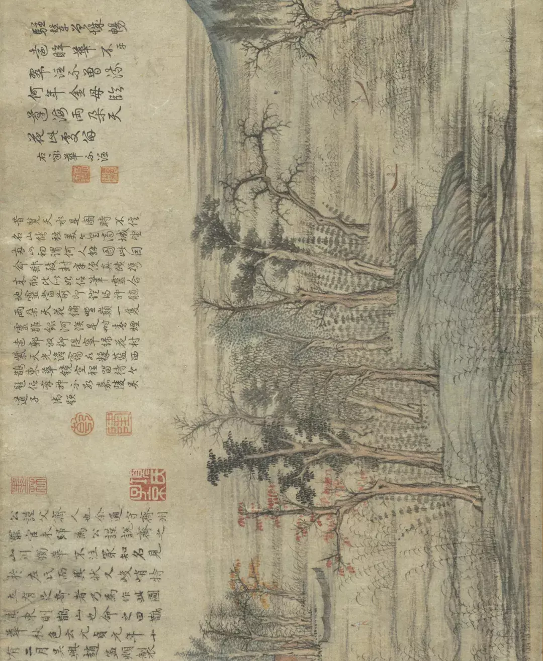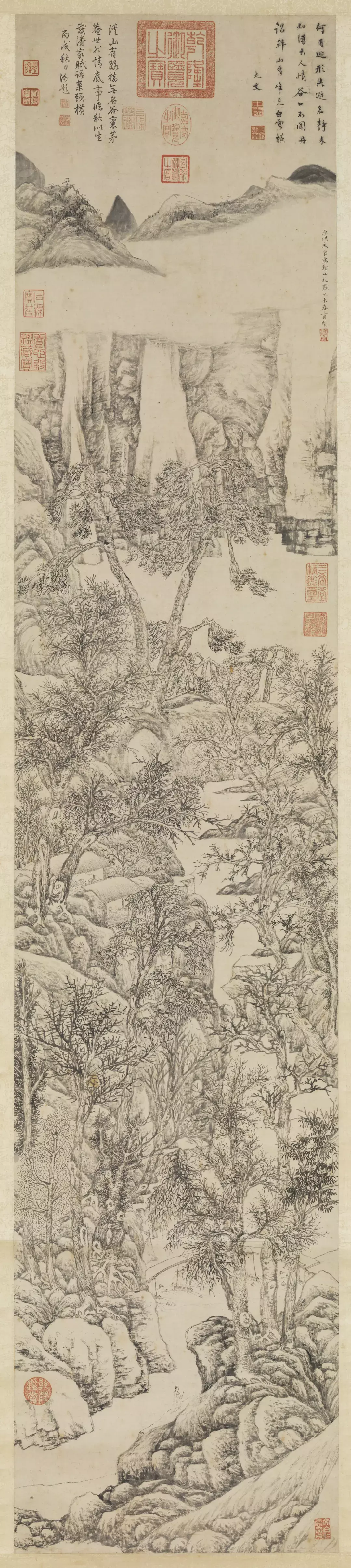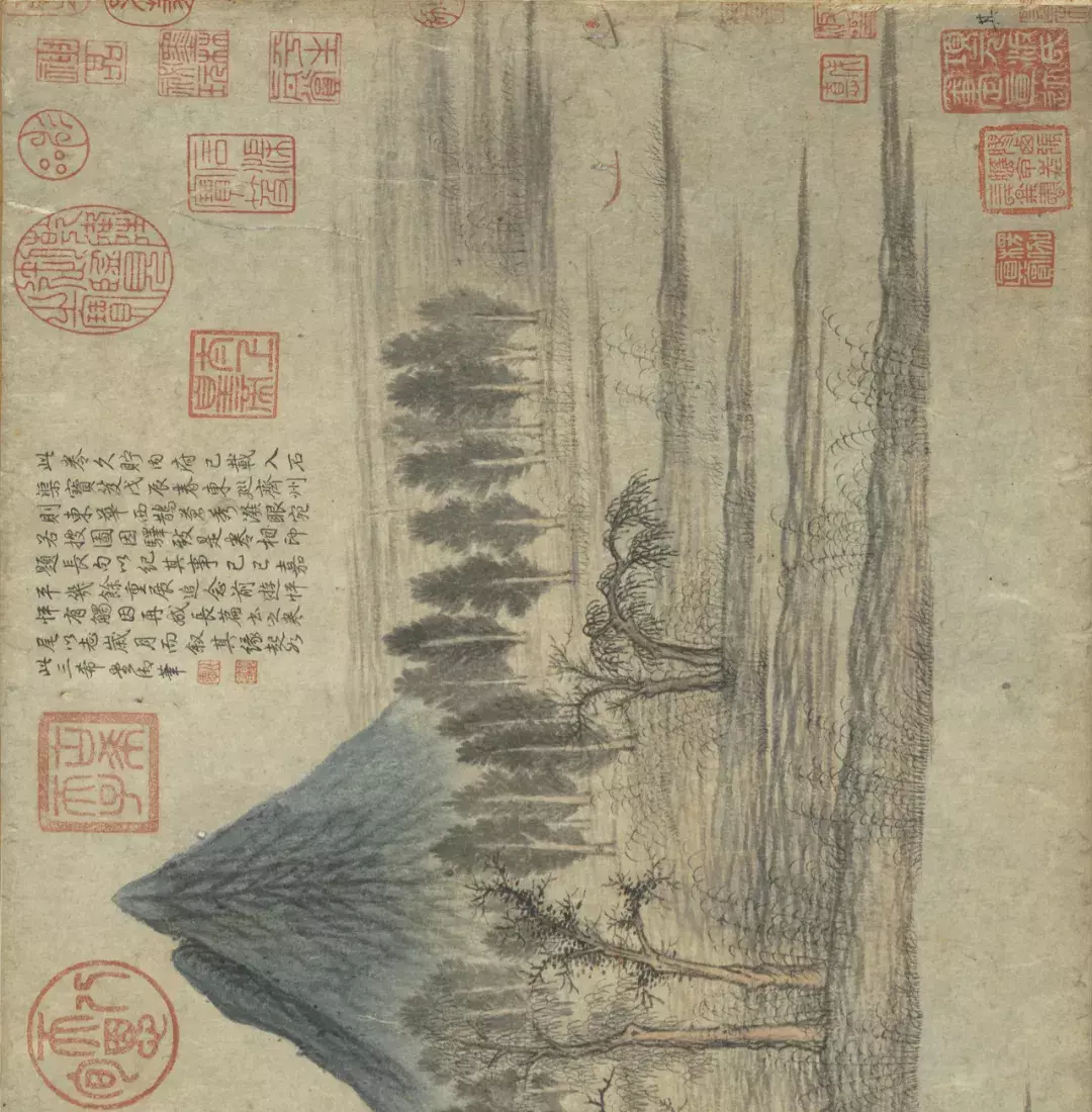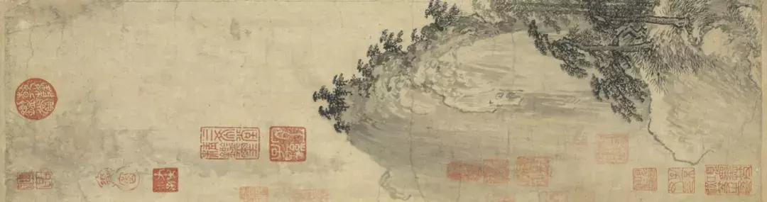 五代巨然《秋山问道图》:此画描绘了高远幽深的秋日山景,山峦重叠,秀润可爱。房舍掩映在茂林之中,小路曲折通幽,颇有山居之幽趣。又见溪水蜿蜒流淌,为画面增添了几分灵动。
