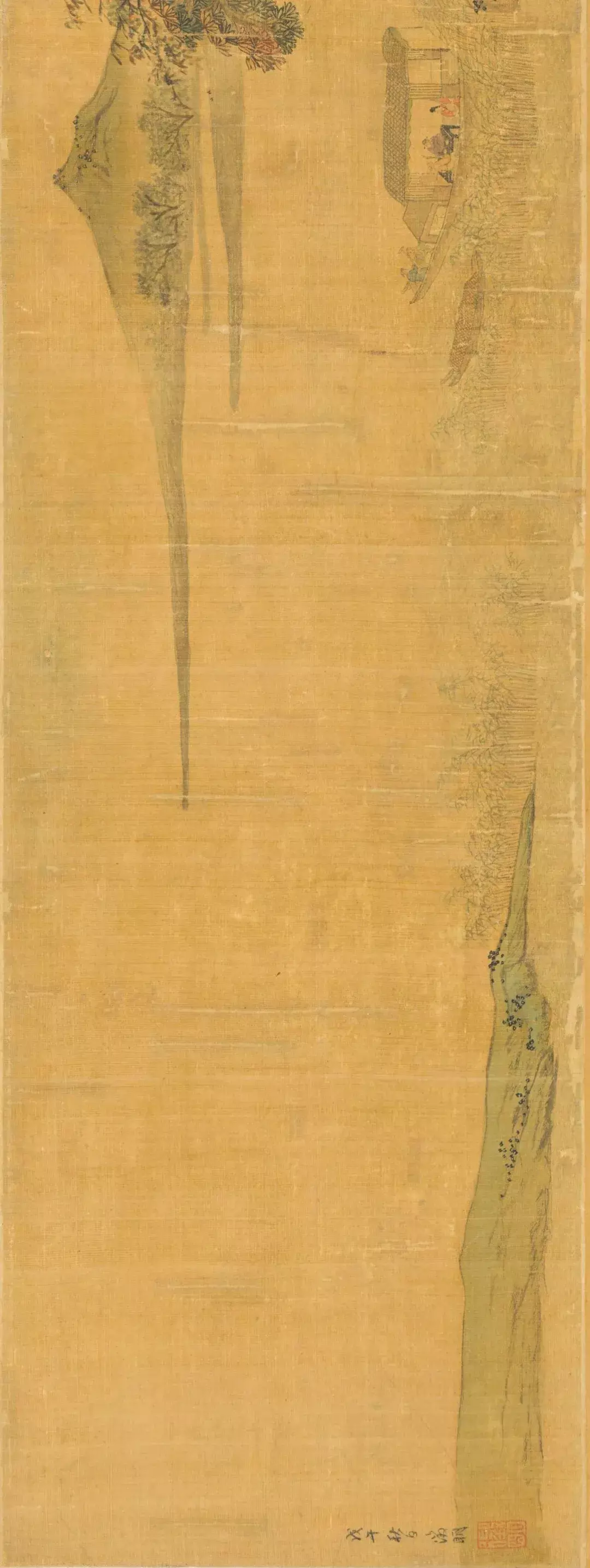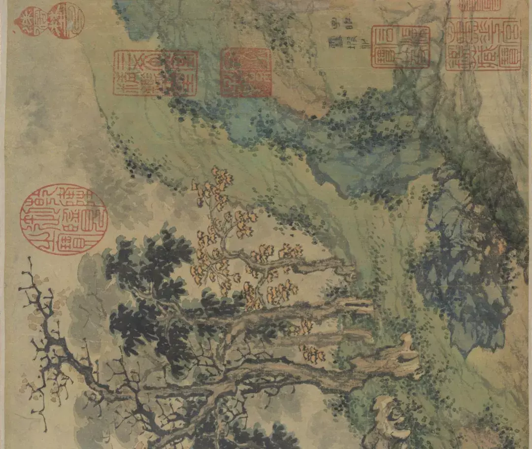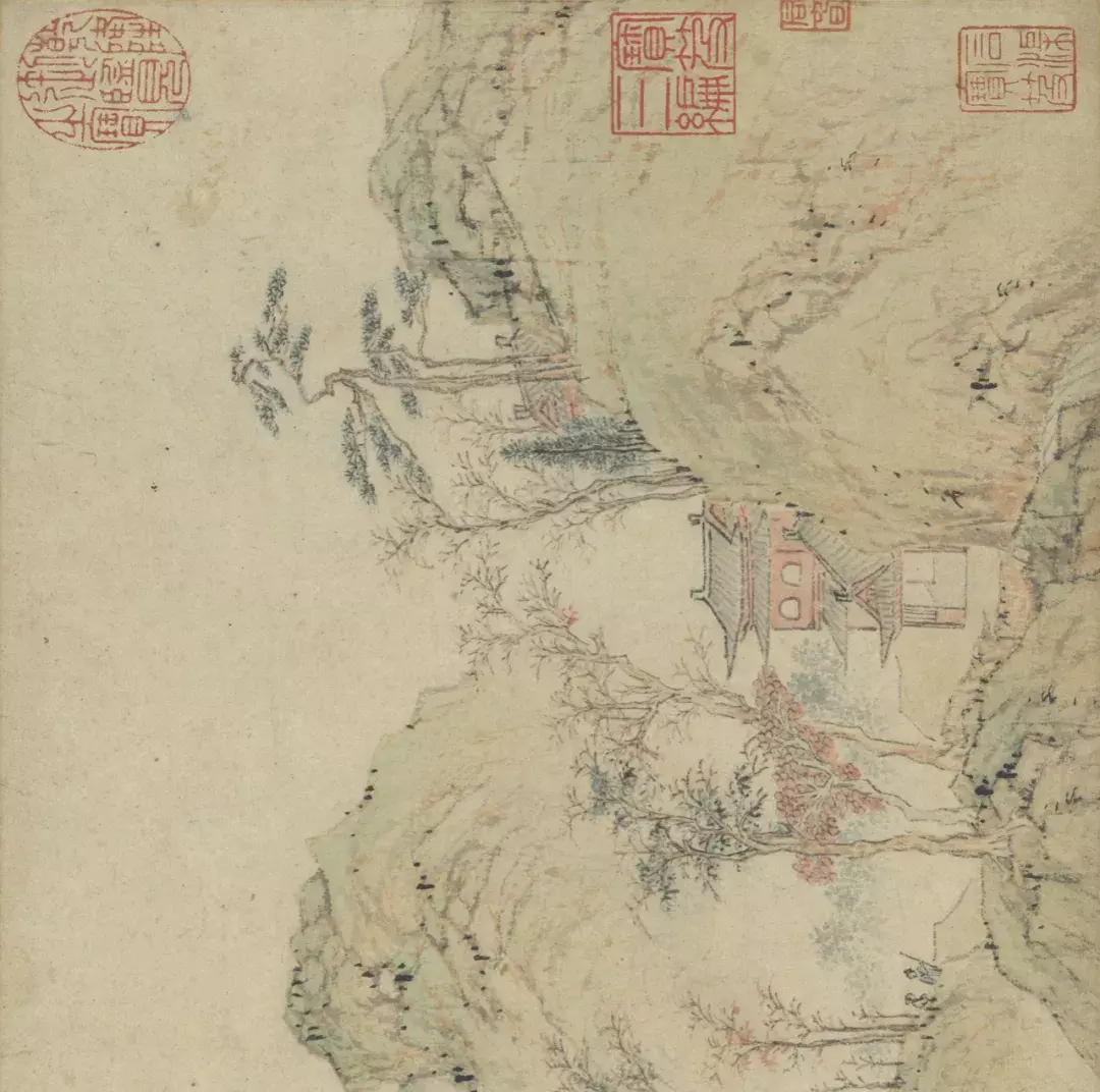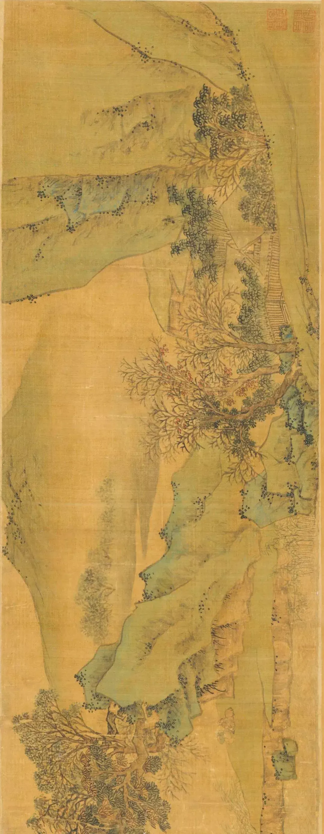 宋代赵伯驹《江山秋色图》:此画山重水复,竹林乔木,楼观屋宇,山庄茅舍,骡纲行旅,画风精密不苟,设色艳丽和谐,章法严谨,造型准确生动,体现了宫廷画院的艺术特色。