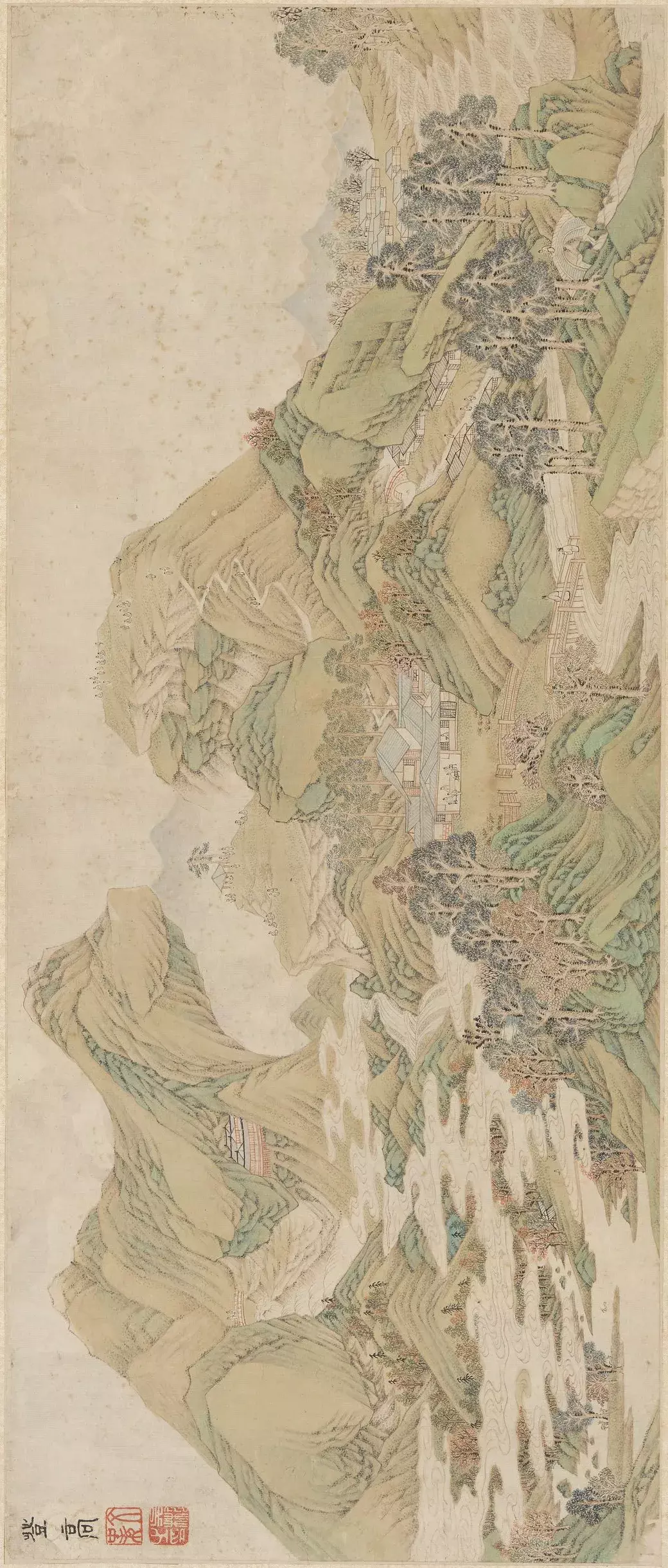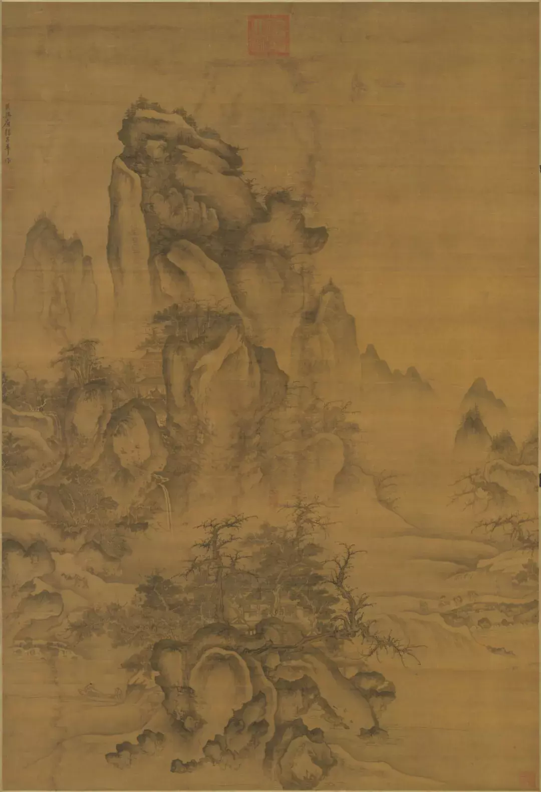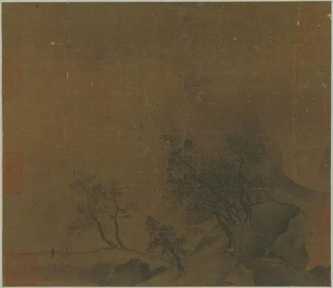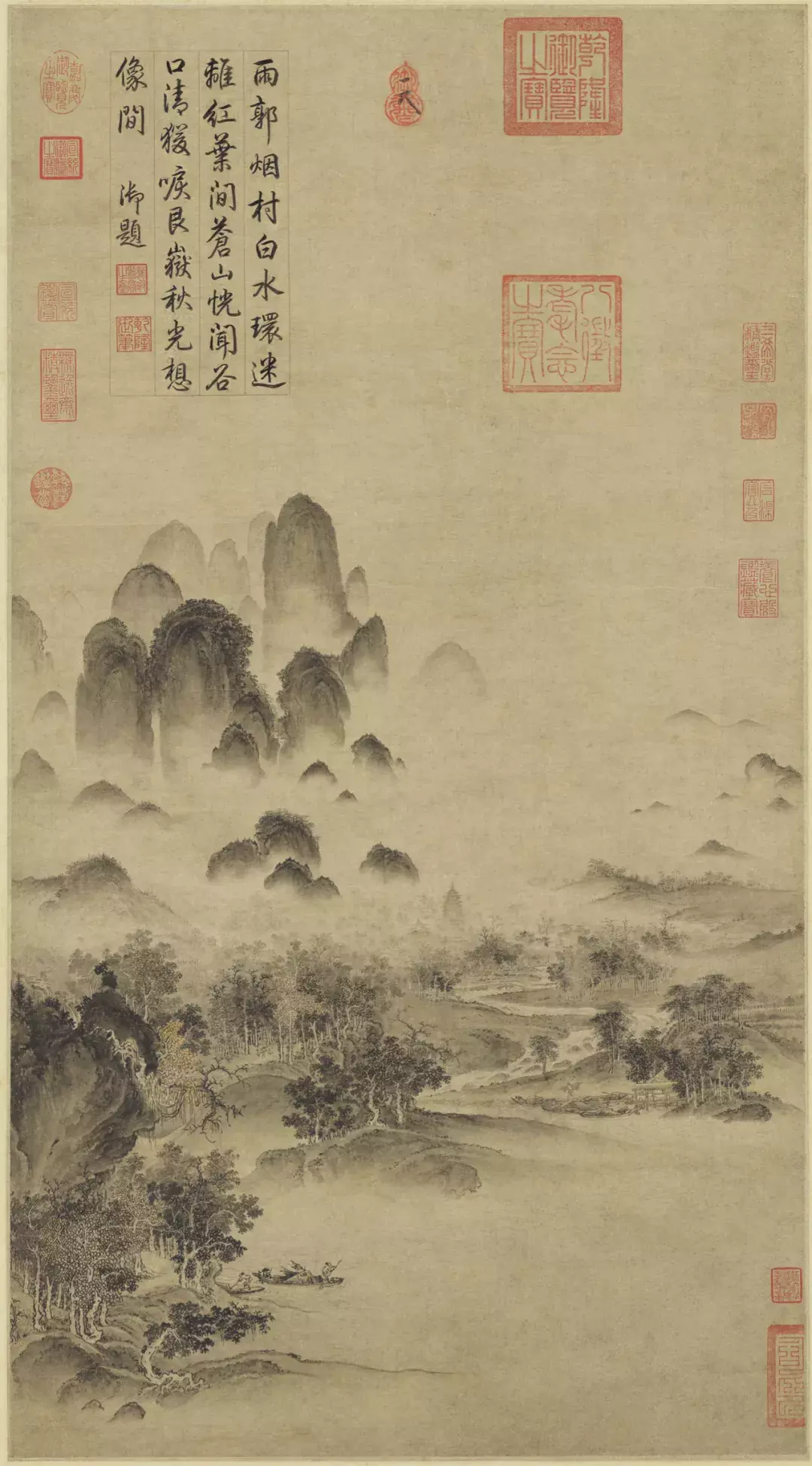 宋代赵伯驹《江山秋色图》:此画山重水复,竹林乔木,楼观屋宇,山庄茅舍,骡纲行旅,画风精密不苟,设色艳丽和谐,章法严谨,造型准确生动,体现了宫廷画院的艺术特色。