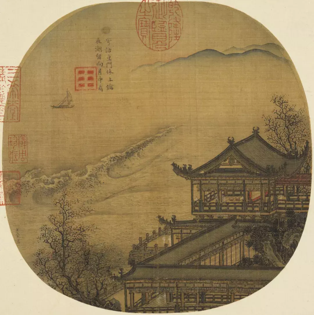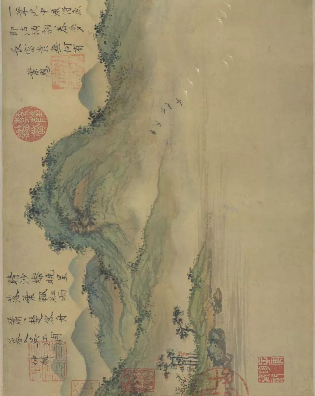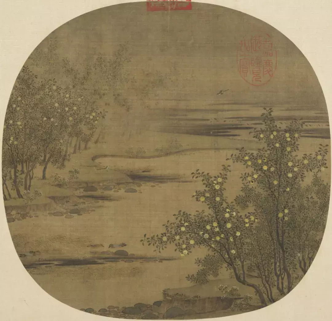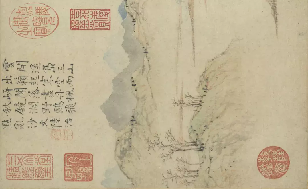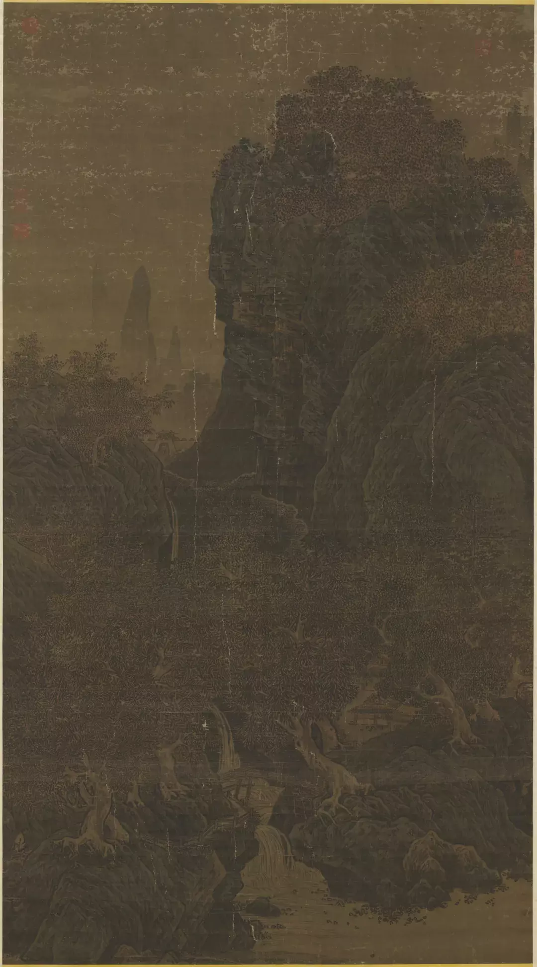 宋代赵伯驹《江山秋色图》:此画山重水复,竹林乔木,楼观屋宇,山庄茅舍,骡纲行旅,画风精密不苟,设色艳丽和谐,章法严谨,造型准确生动,体现了宫廷画院的艺术特色。