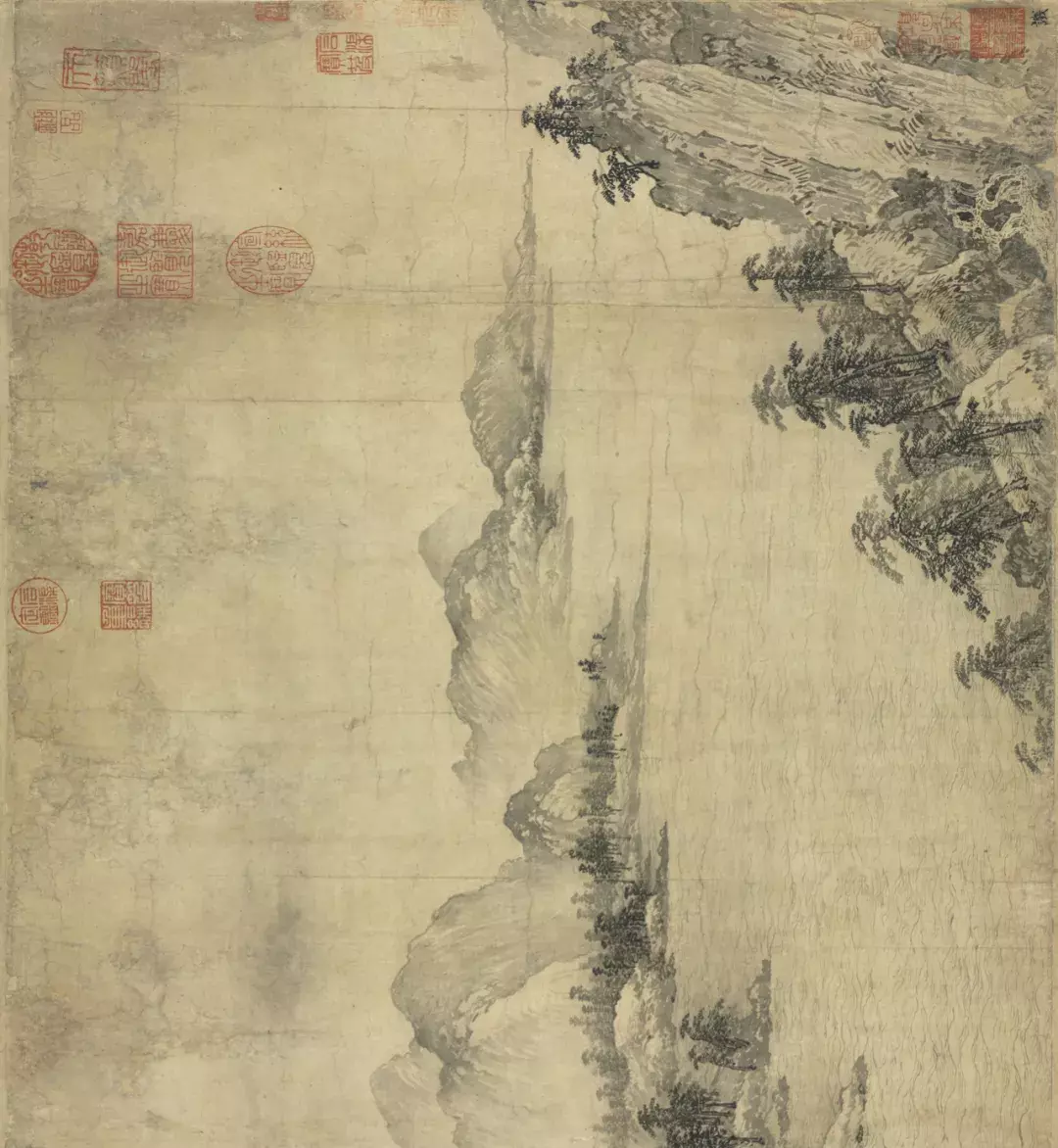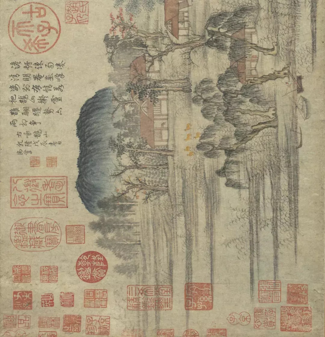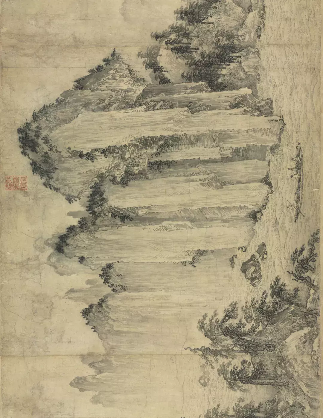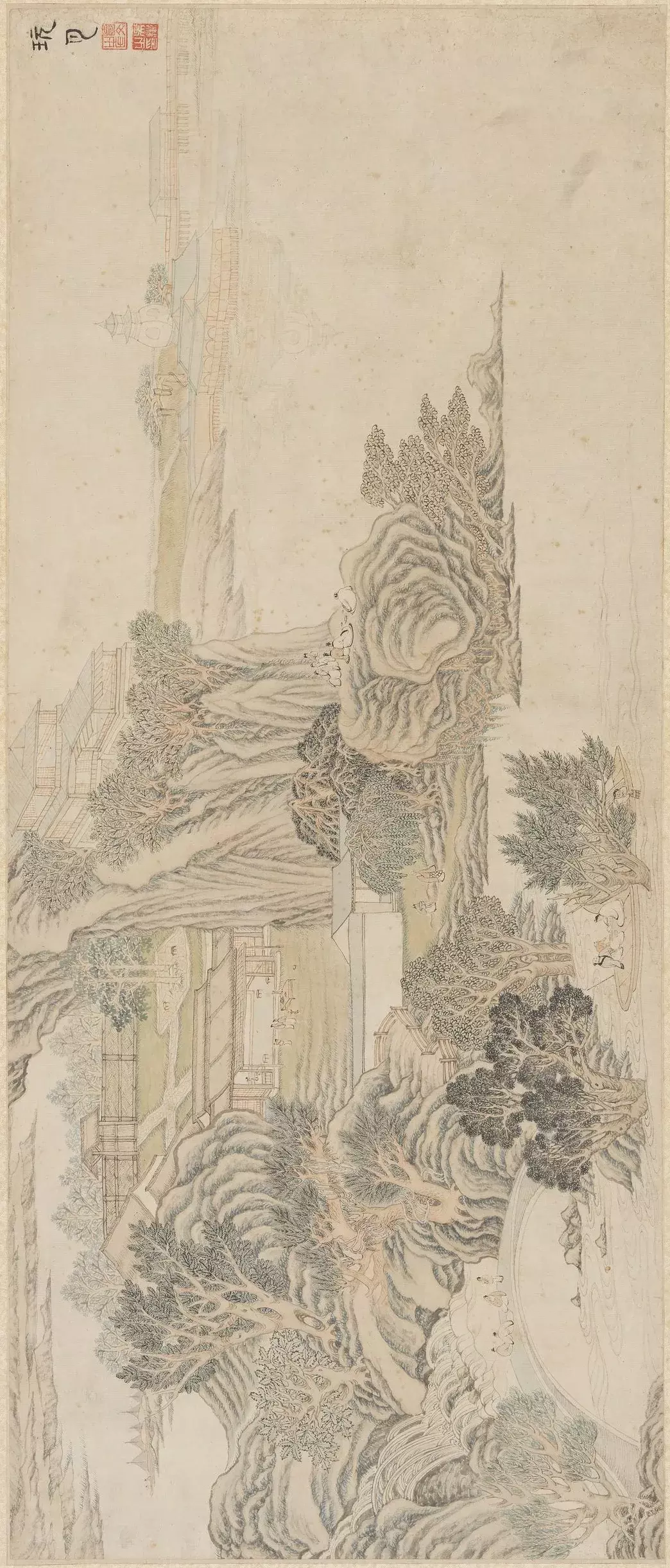 宋代赵伯驹《江山秋色图》:此画山重水复,竹林乔木,楼观屋宇,山庄茅舍,骡纲行旅,画风精密不苟,设色艳丽和谐,章法严谨,造型准确生动,体现了宫廷画院的艺术特色。