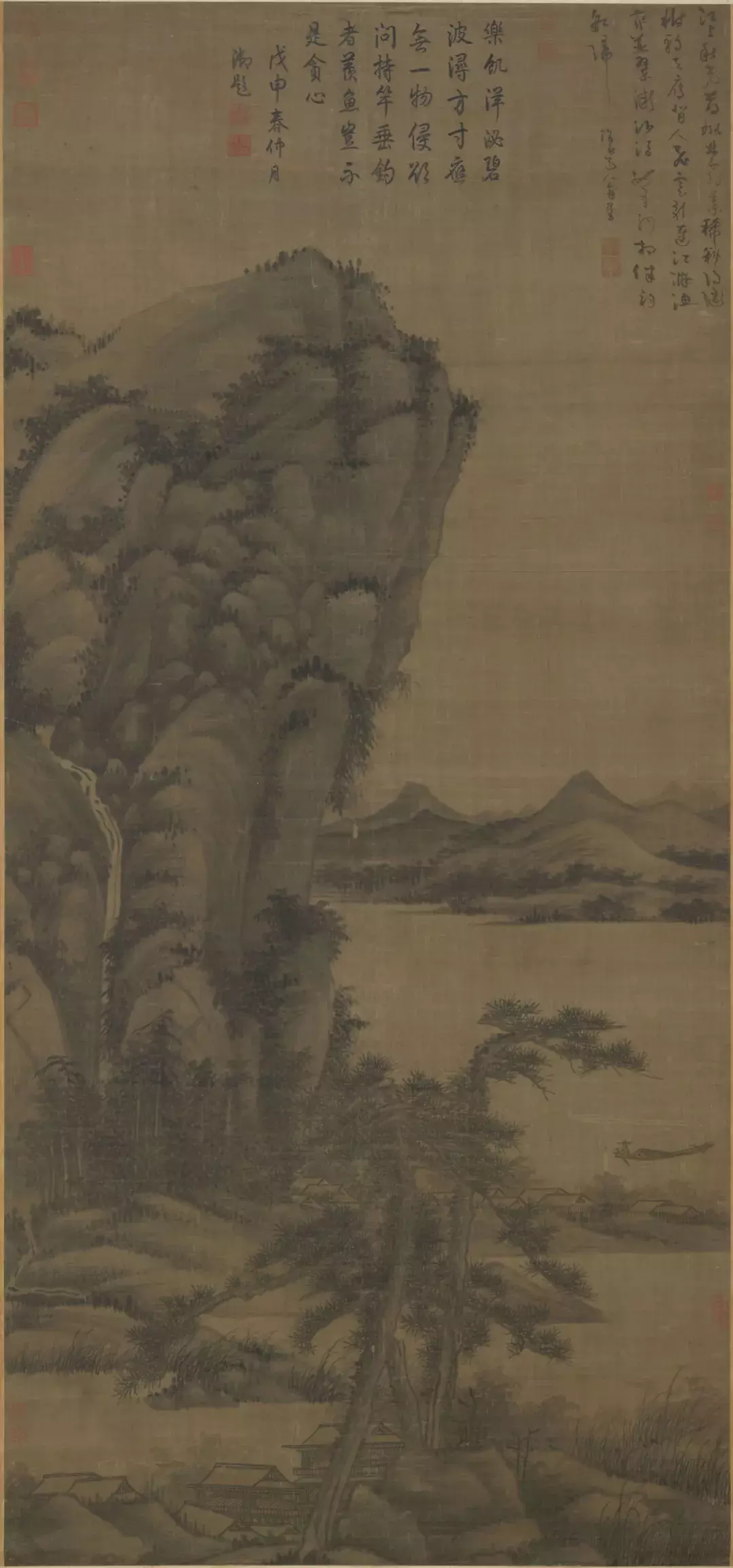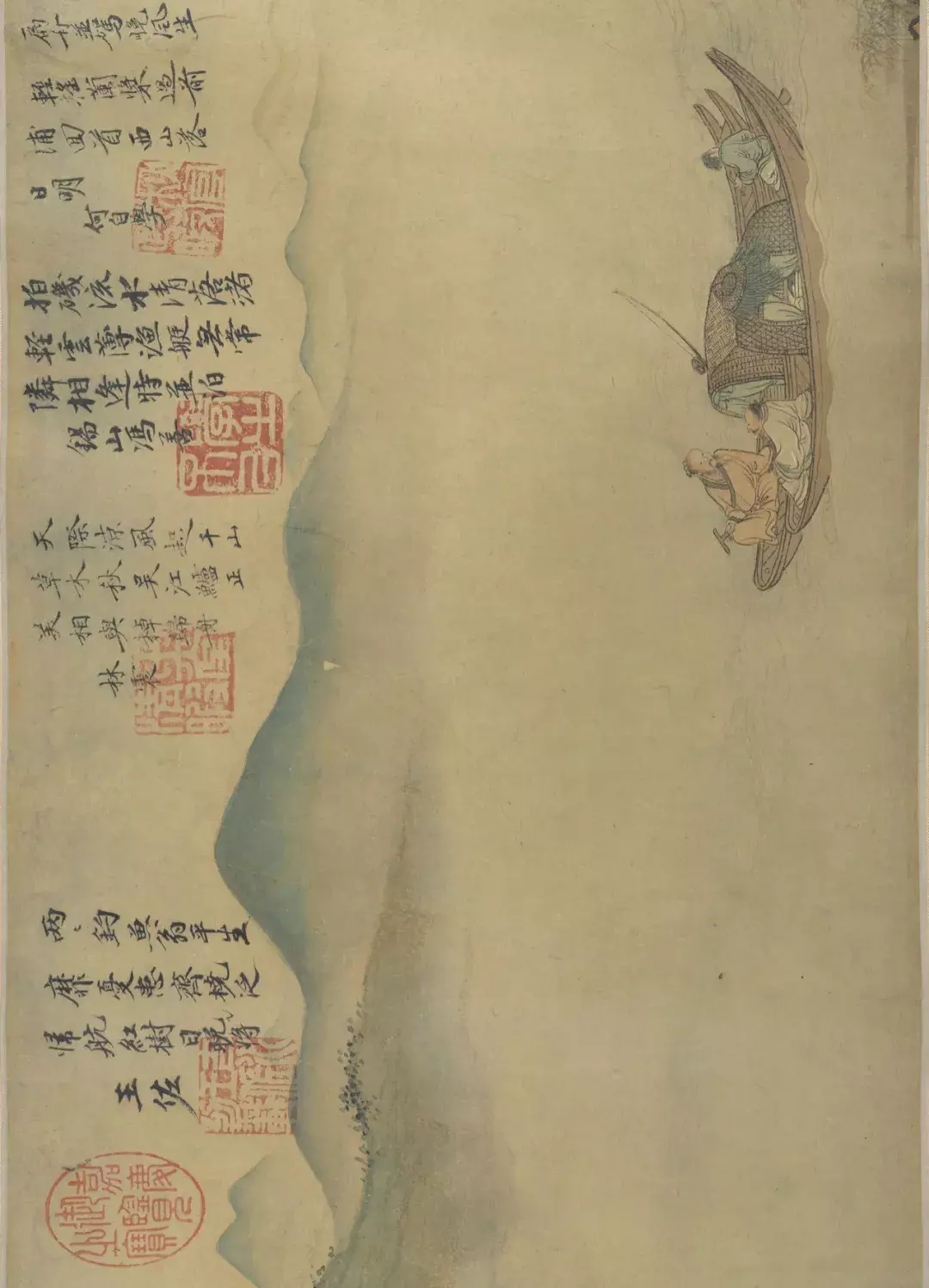 明代仇英《枫溪垂钓图轴》:此画描绘了秋天松柏翠绿、红叶菲菲的景象。画家划一只小船在水中钓鱼,一草一木都尽收眼底,悠然自得,不亦乐乎!