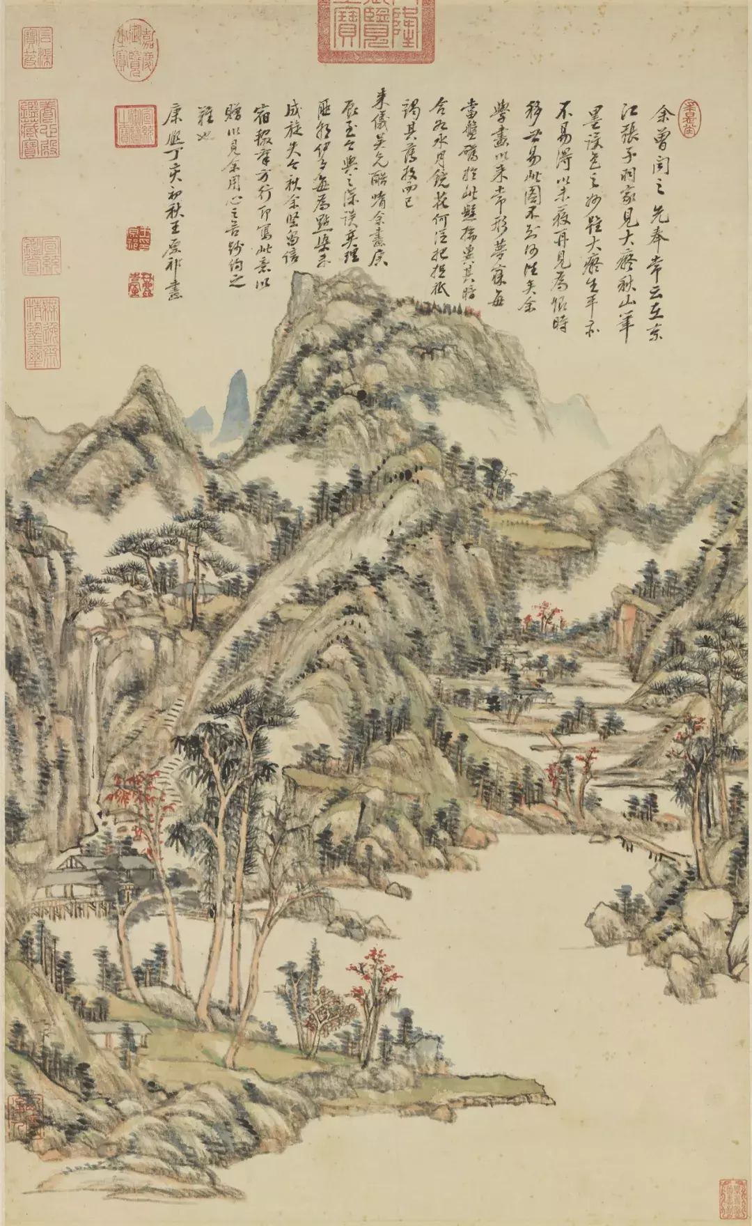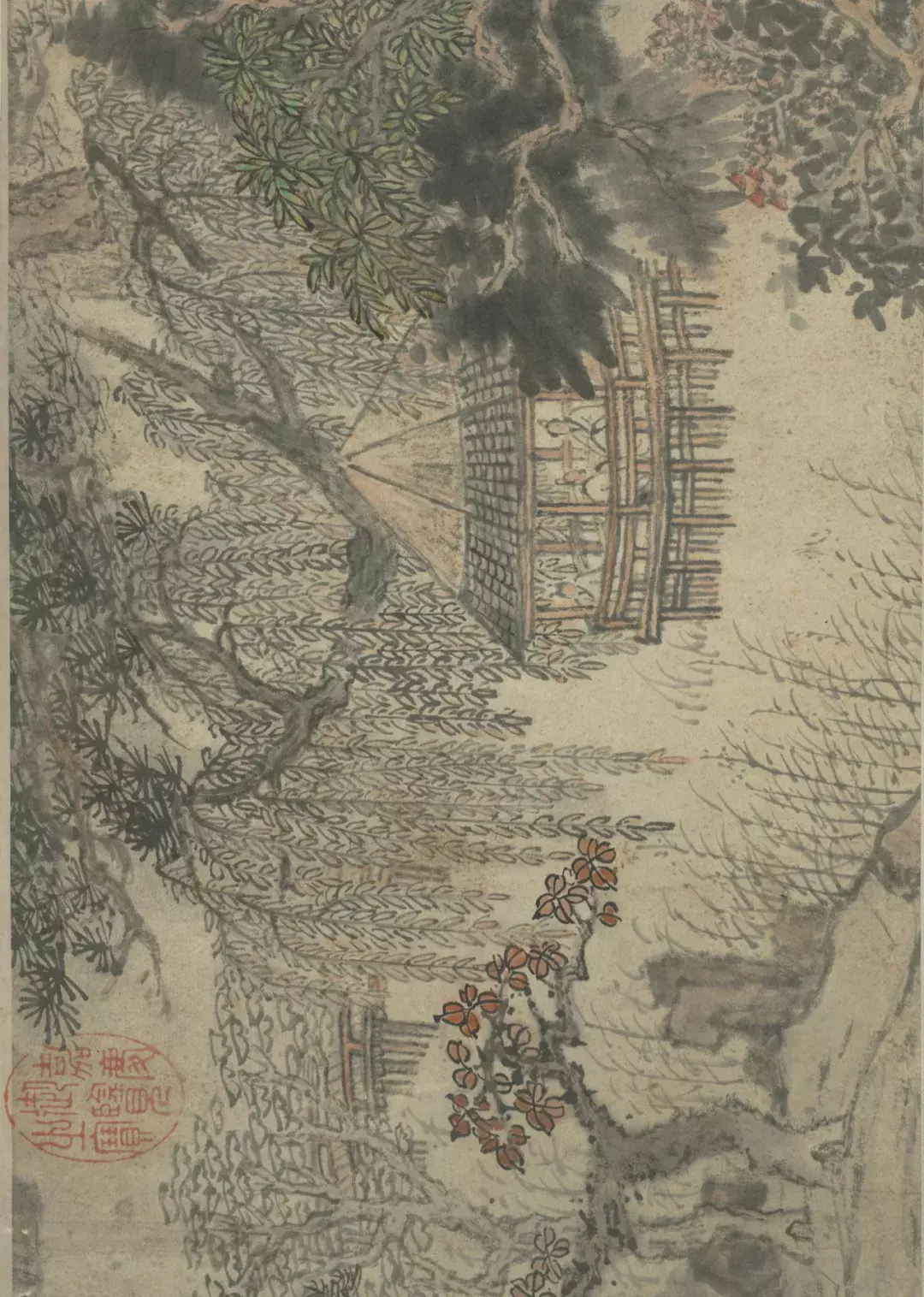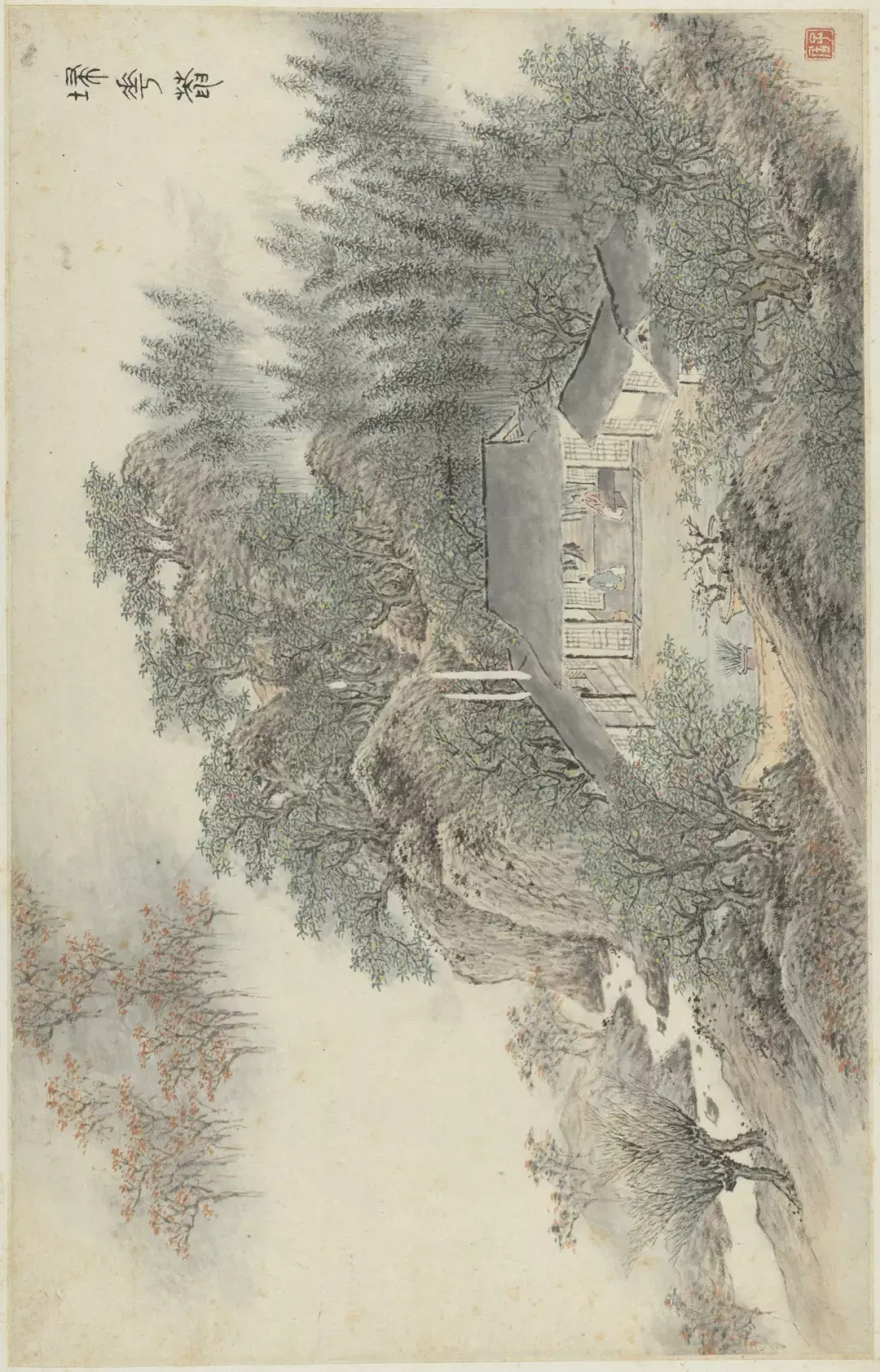 秋季是色彩最为斑斓的季节,画家们巧妙地运用各种色彩来表现秋景的绚烂。如元代王蒙的《秋山草堂图》,用笔细密,山体以赭石敷染,沉稳厚重,树木多以勾线填色绘就,画中枫叶以朱砂点染,用色虽趋艳丽浓郁,但不显轻飘突兀,枫林之色是为画中秋意的点醒之处。