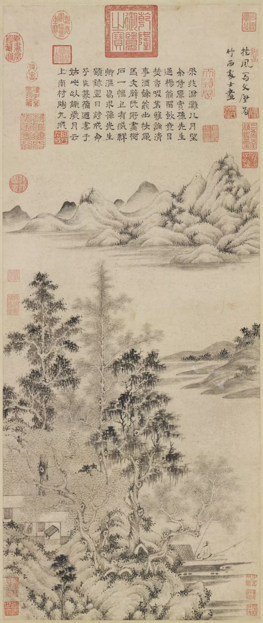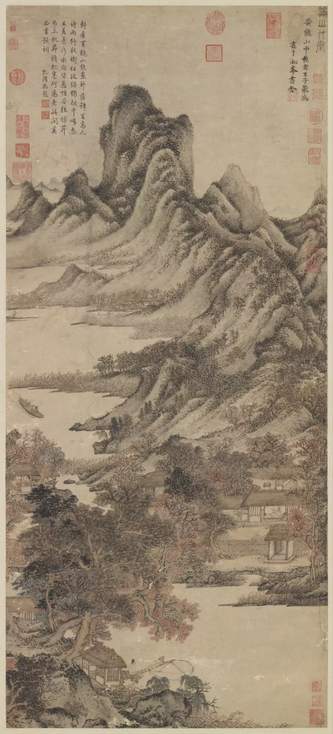 元代王蒙《秋山草堂图》:此画描绘了江南秋日的宜人景色,茂树清淡,秀气水润。群山雄浑又空灵,曲水轻舟书写着诗意。近处山脚草堂临水而欢,不见山寂萧条,却有清幽雅致迸发而出。